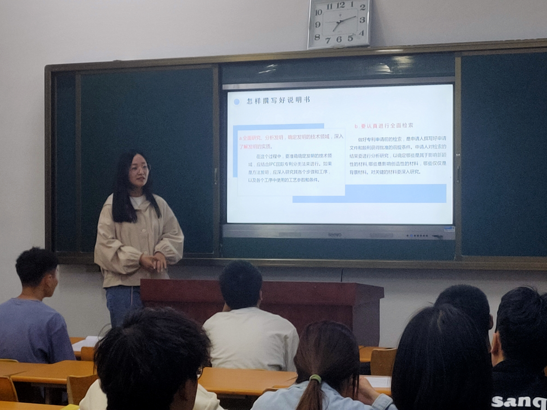 为进一步推动科技创新,促进知识产权保护,SJB世俱杯官方网站学生会副主席孙瑞环在4月29日晚自习于22教学楼507教室为20级软件技术的各位同学进行专利说明撰写讲解活动。